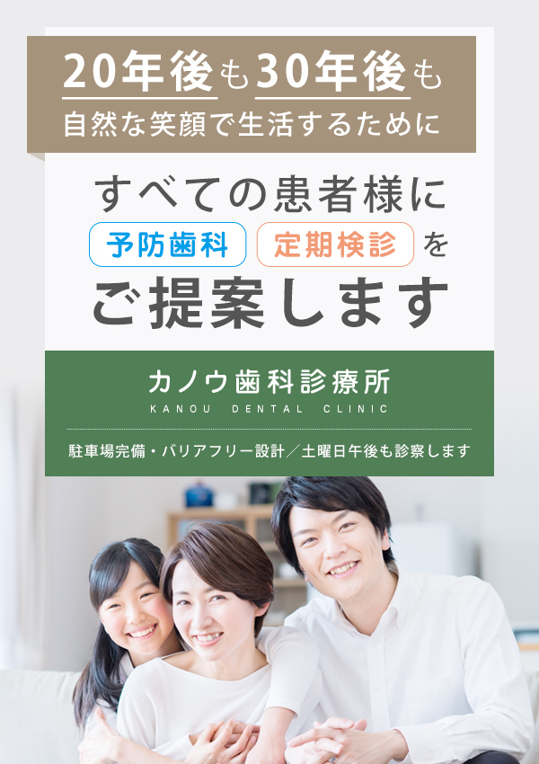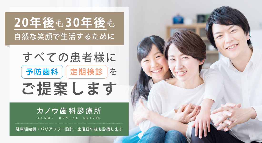 カノウ歯科診療所では、ご自宅での歯磨きはもちろん、むし歯や痛みが無くても定期的に通って頂き、プロである歯科衛生士によるクリーニングを受けることをおすすめしています。歯科医が歯やお口の状況を定期的に確認することができるようになり、むし歯の原因となる磨き残しや歯石が残っていないかを診て、早めの除去が可能となります。